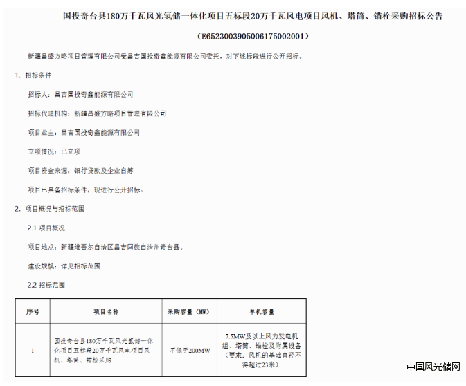 招标项目显示,上述项目标段五、六、七均要求单机容量7.5MW及以上。