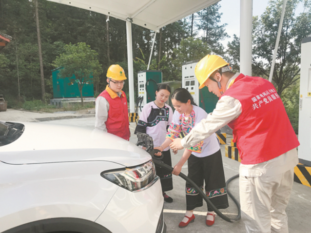 国网湘西供电公司员工指导十八洞村村民使用充电桩。