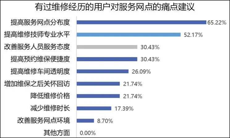 从用户反馈来看,有过维修经历的用户比没有维修经历的用户更迫切地需要售后服务网点提高维修技术的专业水平,存在该痛点的用户比例为52.17%,仅仅次于“提高服务网点分布度”。