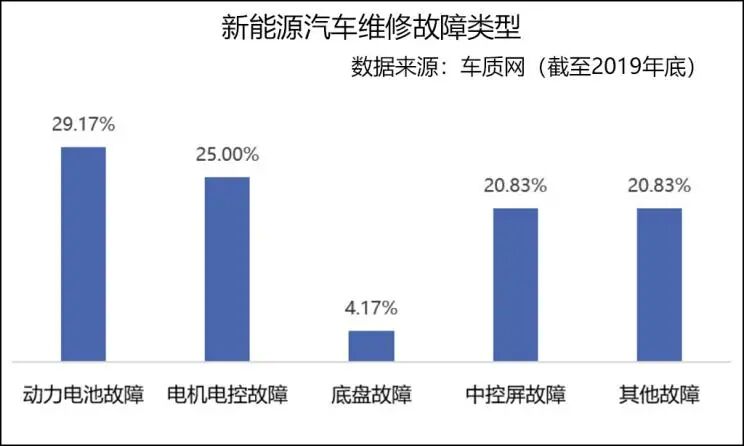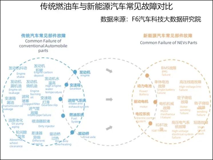 (1)维保业务类型的独特性:传统燃油汽车的故障主要集中在发动机、变速箱、进排气系统、燃油系统和驱动桥等部位,发动机和变速箱的故障类型较多。然而,由于动力结构的差异,新能源汽车的故障主要体现在动力电池、驱动电机与电控系统,较为简单集中。与此同时,车载智能中控屏的故障率也较高。