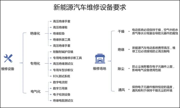 新能源汽车维修设备要求较高,且必须配合规范的维修场地。其中,维修设备具有绝缘化、专用化和电气化三大特征,维修场地需要满足干燥、绝缘、除尘、通风等条件。