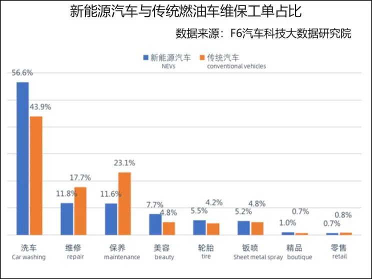 (2)维保需求结构的独有性:从新能源汽车维保业务的工单结构来看,新能源汽车的维修和保养工单比例(11.89%,11.69)远远低于传统燃油汽车(17.%,23.1%)。相反,新能源汽车在洗车、美容、轮胎、钣喷业务的工单比例更高。这表明新能源汽车相对传统汽车而言具有维修、保养频率低的特点。