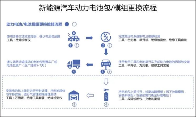 以动力电池包更换为例,首先第一步需要使用故障诊断仪读取故障码,确认电池包故障,第二步利用密封塞、举升机、绝缘检测仪、绝缘工具套装来完成高压电系统断电及绝缘检测,第三步是使用举升机、万用表、绝缘工具套装来完成动力电池的拆卸和安装,最后是通过陆路运输损坏的电池包到整车厂或电池包原厂。