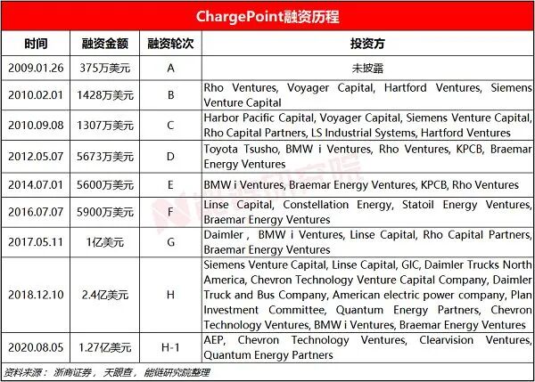 9轮共融资超6亿美元。ChargePoint自2009年获得A轮融资以来,截至2021年1月,共完成9轮融资,累计融资金额6.7亿美元,其中2020年8月最新一轮融资金额为1.27亿美元,投前估值15.8亿美元。