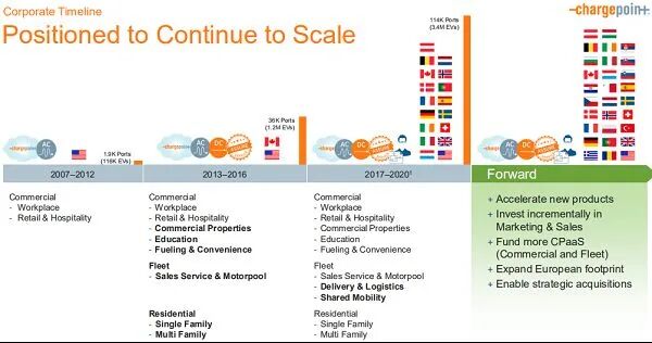 计划2021年IPO,估值24亿美元。2020年9月,ChargePoint 宣布拟通过与空壳公司Switchback Energy Acquisition Corp合并上市,估值24亿美元。
