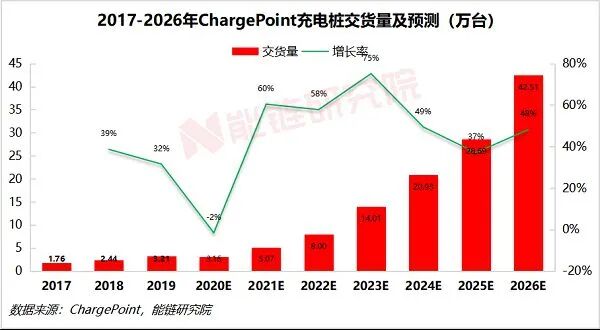 充电桩交货量年均增长35%。2019年ChargePoint充电桩交货量为3.21万台,同比增长32%。2017-2019年,复合年均增长率(CAGR)为35%。预计2020年将实现3.16万台交货量,2026年将实现42.51万台。