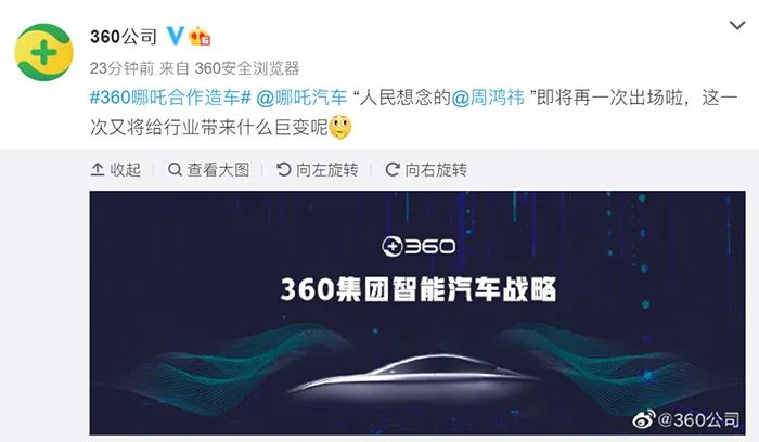 5月10日下午,360公司在官方微博上发文称,将与造车新势力代表之一的哪吒汽车“合作造车”,并提到将给行业带来“巨变”,这意味着360公司正式加入智能汽车队伍。该微博同时配图为“360集团智能汽车战略”,预计双方将于近期召开新闻发布会,并公布本次合作计划的更多细则。值得一提的是,微博中还@周鸿祎并表示其将再次出场,预示着360造车业务将由周鸿祎亲自带队。